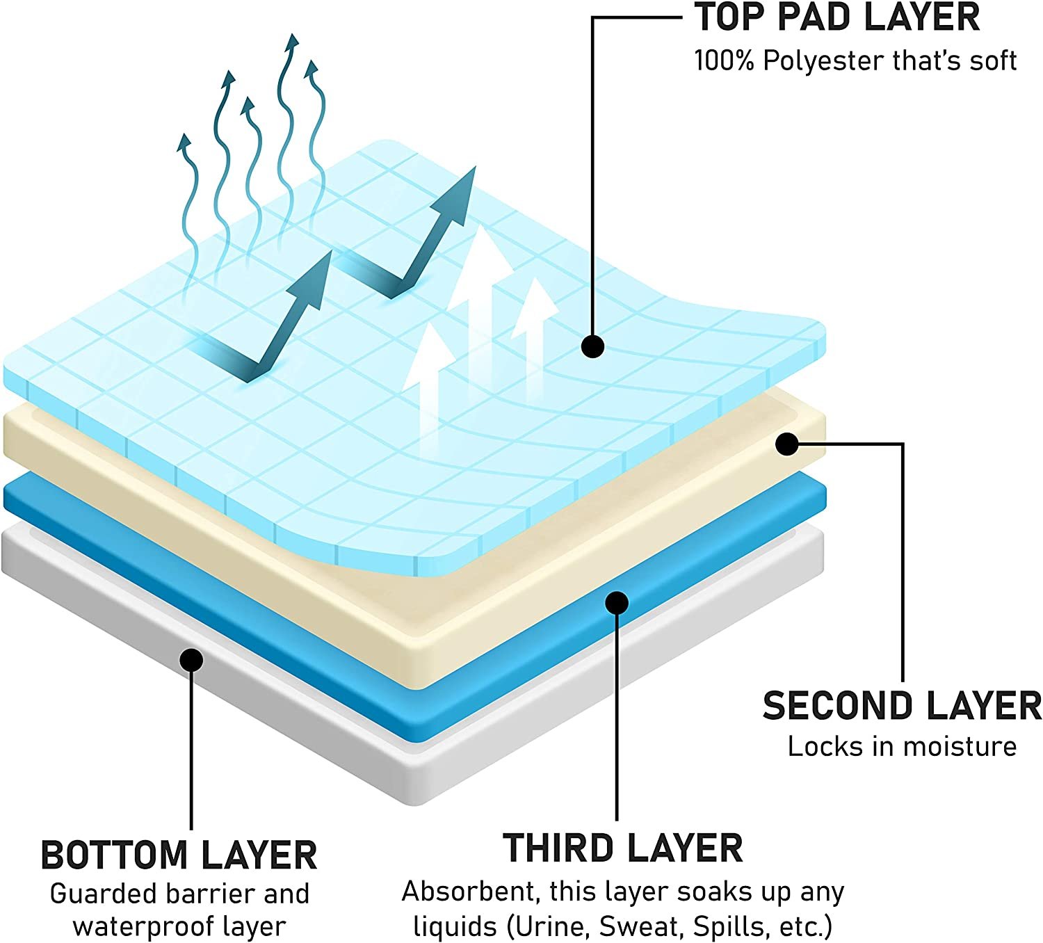 - FOUR LAYER PROTECTION: Thanks to the 4-layer construction, your Atcha Ba washable underpads offer protection against liquid spills and messy wetness. The pad prevents liquid from seeping through while staying dry. It has high absorbency and locks any moisture, pee, in the center without letting it leak through; ultimate leak proof solution pad!